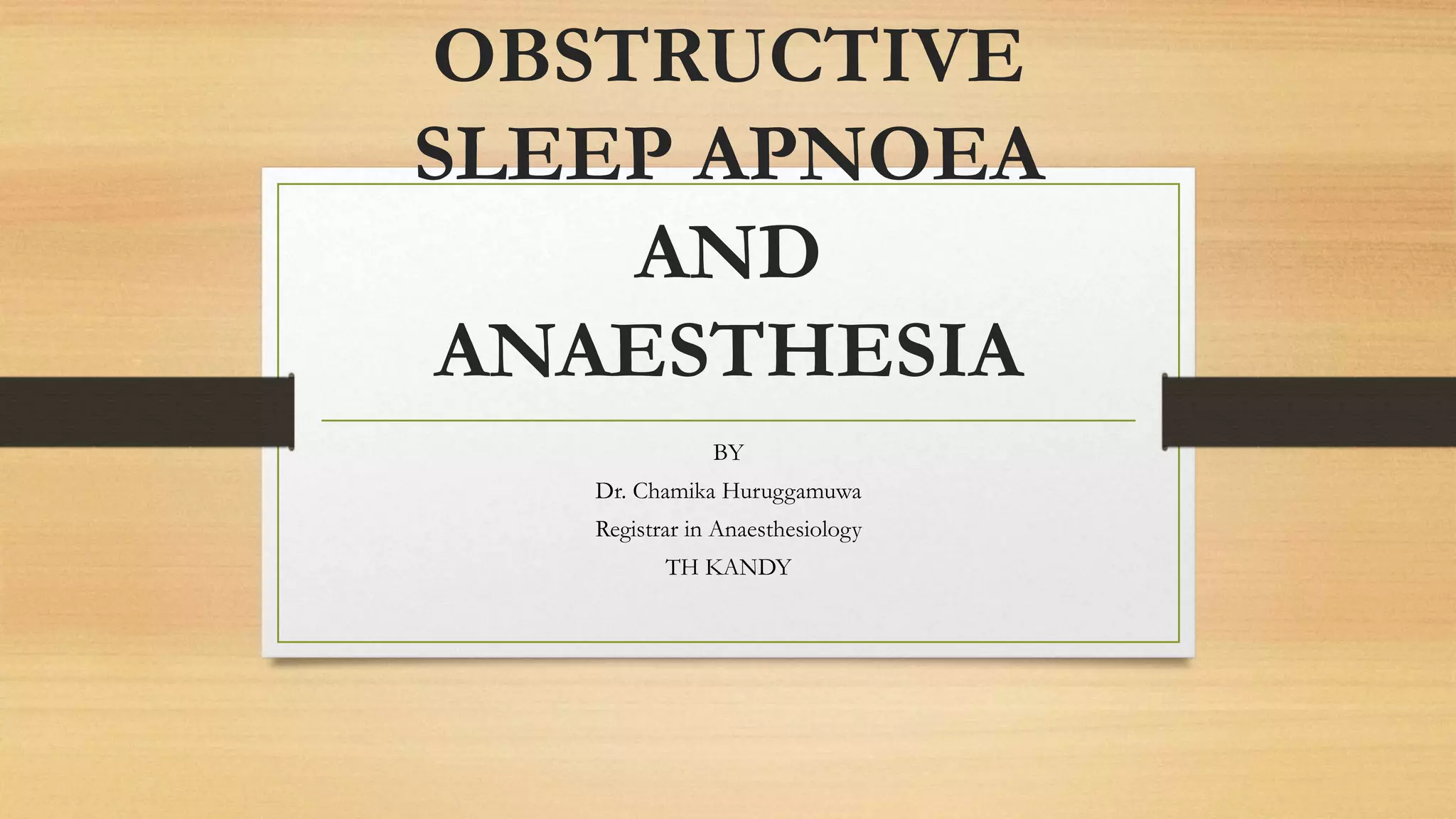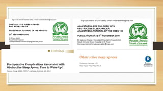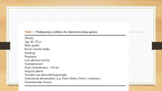 This document provides an overview of obstructive sleep apnea (OSA) and its implications for anesthesia. It defines OSA and discusses its causes, diagnosis, and physiological effects. It outlines risks of anesthesia for those with OSA, including difficult intubation and postoperative respiratory depression. It recommends preoperative screening and treatment with CPAP or weight loss. Intraoperatively, it advises securing the airway and avoiding sedatives that could cause collapse. Postoperatively, supplemental oxygen is important due to risk of apnea and respiratory depression upon waking.