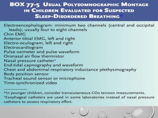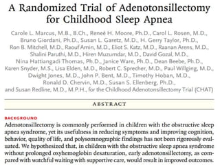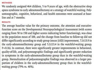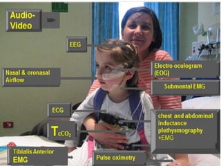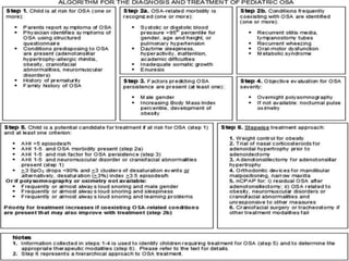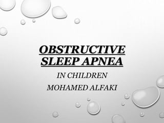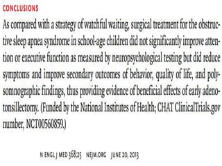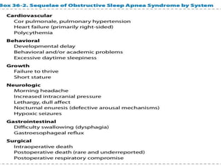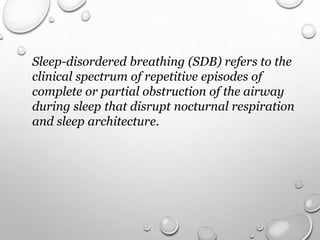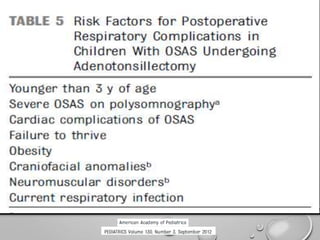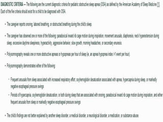 Obstructive sleep apnea (OSA) in children refers to the spectrum of repetitive complete or partial obstructions of the airway during sleep that disrupt breathing and sleep architecture. OSA is common in young children ages 2 to 8 years old, affecting approximately 2-3% of children. It is diagnosed if there is a greater than 90% drop in airflow for at least two missed breaths during sleep studies. Treatment involves weight reduction, avoiding sedatives, tonsillectomy and adenoidectomy which is usually first line treatment, and CPAP if symptoms persist after surgery or it is not performed. Children with Down syndrome are particularly at high risk for OSA due to anatomical factors. [/SUMMARY]