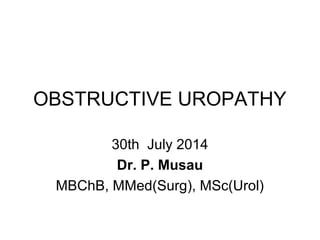 Obstructive uropathy can affect people of all ages and has varied presentations depending on the site and degree of obstruction. It can be caused by mechanical factors like congenital anomalies, inflammation, tumors, or stones, as well as functional issues related to neurological or muscular disorders. Common symptoms include pain, hematuria, and hydronephrosis. Diagnostic workup involves lab tests, imaging like ultrasound, CT, IVP, and procedures like cystoscopy. Treatment aims to relieve the obstruction through catheters, stents, or other surgeries, while also treating infections or other complications. Complete or solitary kidney obstructions require urgent intervention to prevent serious issues like renal failure.