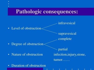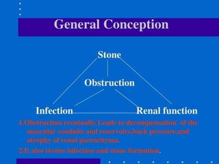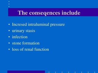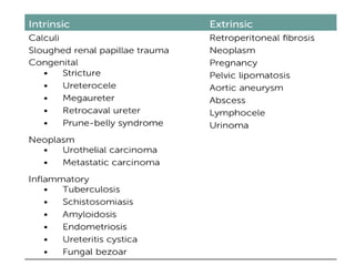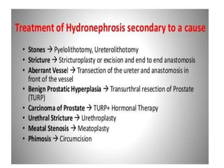 Hydronephrosis is the swelling of one or both kidneys due to a build-up of urine caused by a blockage or obstruction preventing urine from draining normally from the kidney to the bladder. Pyonephrosis occurs when hydronephrosis is further complicated by a kidney infection, resulting in pus collecting in the swollen kidney. Treatment options for hydronephrosis include minimally invasive procedures like percutaneous nephrostomy tubes, ureteral stents, and nephrolithotripsy, as well as open surgical operations to bypass or remove the obstruction.