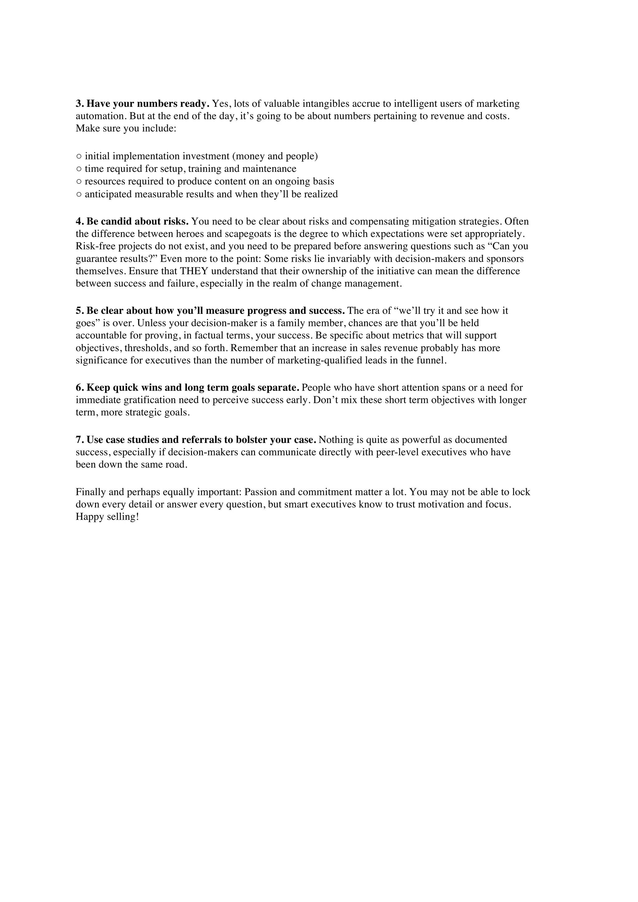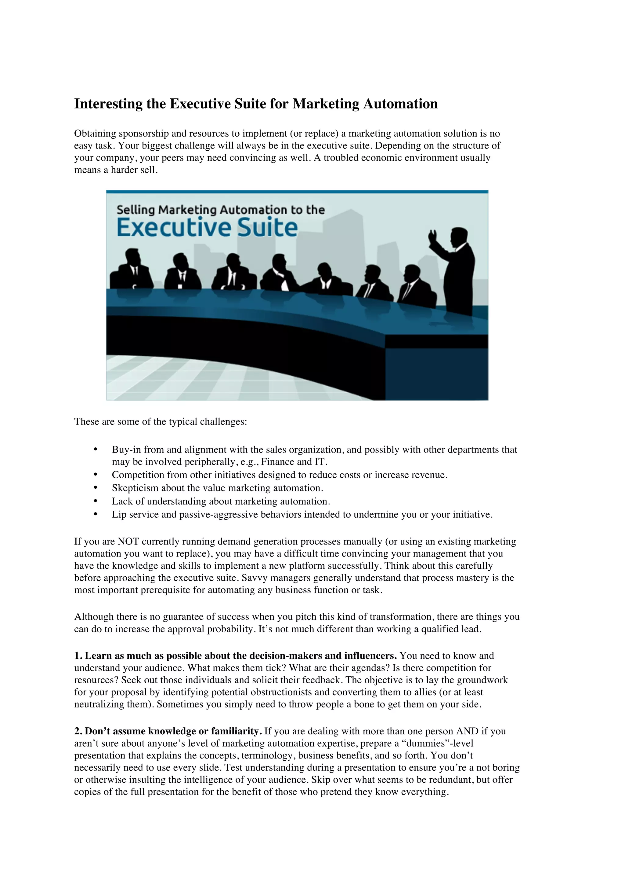 Implementing or replacing a marketing automation solution requires convincing executives and overcoming challenges. These include gaining buy-in from sales and other departments, competing initiatives, skepticism about value, and lack of understanding. To increase approval probability, thoroughly understand decision-makers, present concepts simply, provide implementation costs and anticipated results, candidly discuss risks, define clear metrics, separate short and long-term goals, and use case studies and referrals to bolster the case. Passion and commitment can also help convince executives.
