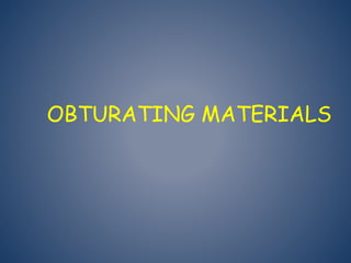 This document discusses root canal obturation materials and techniques. It begins by introducing the objectives of obturation, which are to eliminate leakage and seal any remaining irritants in the root canal system. Next, it classifies root canal filling materials, discussing both solid core materials like gutta percha, silver, and stainless steel files, as well as sealers. The ideal properties of obturation materials are also outlined. The document concludes by describing various obturation techniques and different forms of gutta percha points that are available.