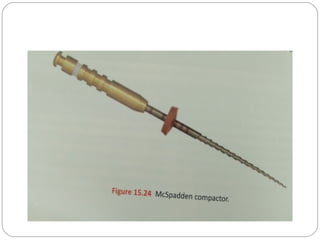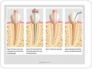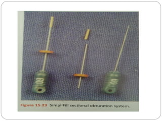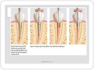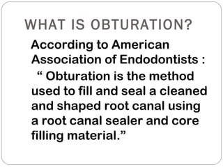 The document discusses various aspects of root canal obturation including definitions, purposes, techniques, and materials. Obturation involves filling and sealing the cleaned and shaped root canal using gutta-percha and a sealer. The goals are to achieve a fluid-tight seal, prevent microleakage and reinfection. Common techniques include cold lateral compaction, warm vertical compaction using heat carriers, continuous wave compaction, and thermoplasticized gutta-percha injection. Carrier-based techniques like Thermafil and SimpliFill are also described. Key factors for treatment success include absence of preoperative lesions, void-free fillings, obturation within 2mm of the apex, and adequate coronal restoration