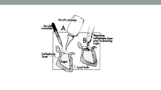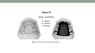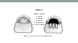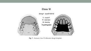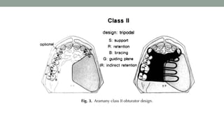 This document provides an overview of obturators for acquired maxillary defects. It discusses the historical development of obturators, objectives and ideal requirements, materials used for fabrication, classifications based on origin of defect and location, indications and functions. It also covers design considerations for support, retention and stability. Obturators are prosthetic devices used to close acquired openings of the hard palate and/or soft palate following surgery or trauma. They aim to restore esthetics and function like speech, swallowing and mastication.