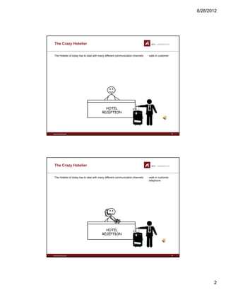 The document discusses the many communication channels that modern hoteliers must deal with, including walk-in customers, telephone, email, fax, websites, review sites, booking sites, social media, blogs, forums, and more. It notes that hoteliers not only have to manage these various channels, but also pay up to 15% in sales commissions to booking sites. The document proposes a solution called the Semantic Communication Engine Innsbruck to help hoteliers better manage multi-channel communications and increase direct bookings.