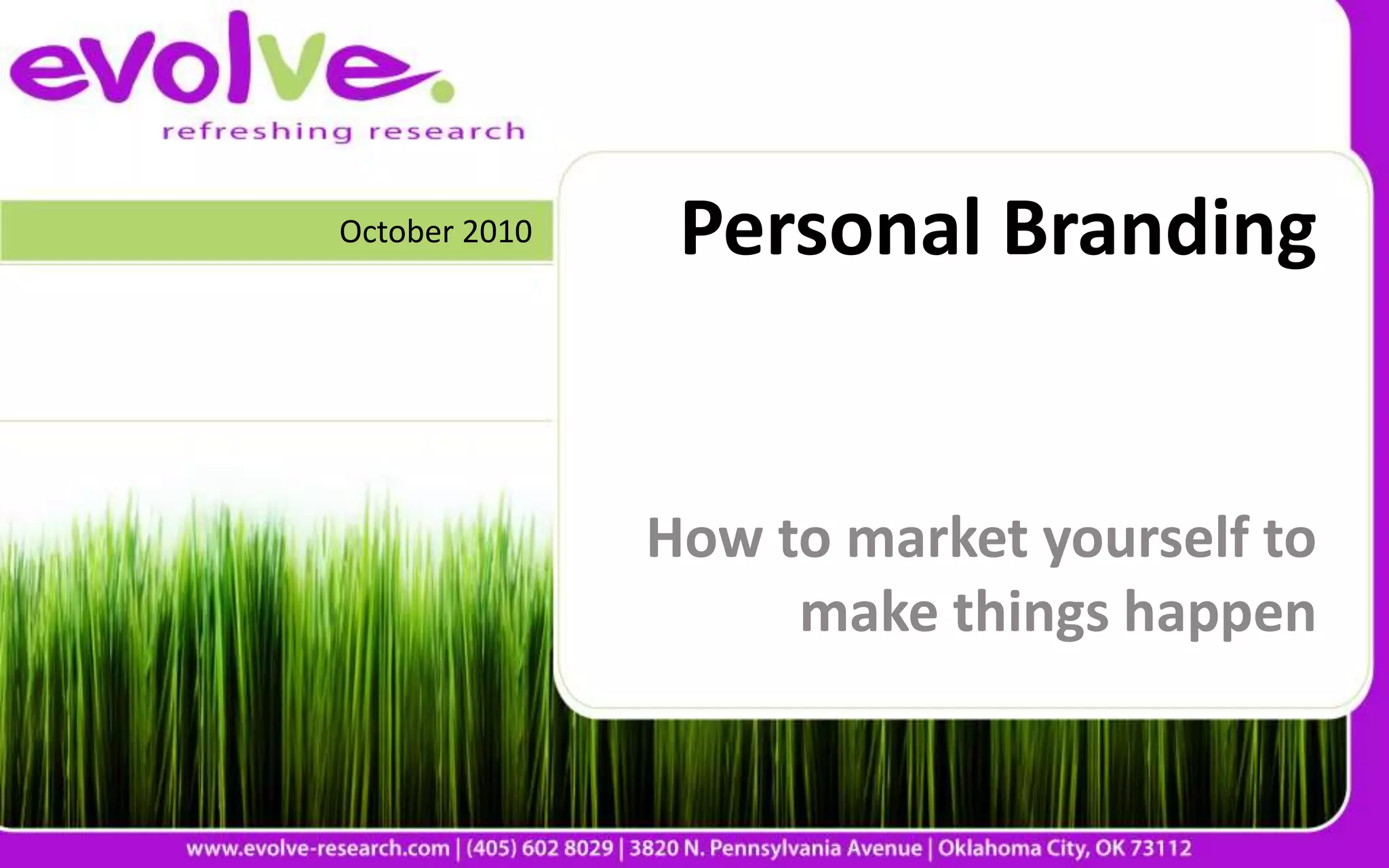 This document discusses personal branding and how to market yourself. It explains that personal branding is how others see you, especially employers, and involves presenting yourself as a reliable and capable product. It emphasizes that everything you do can impact your future career. The document then provides tips for developing a strong personal brand, including defining your personality, showing a positive attitude, having good manners, demonstrating your knowledge and willingness to learn, dressing appropriately, using social media carefully, and allowing your brand to evolve over time with common sense.