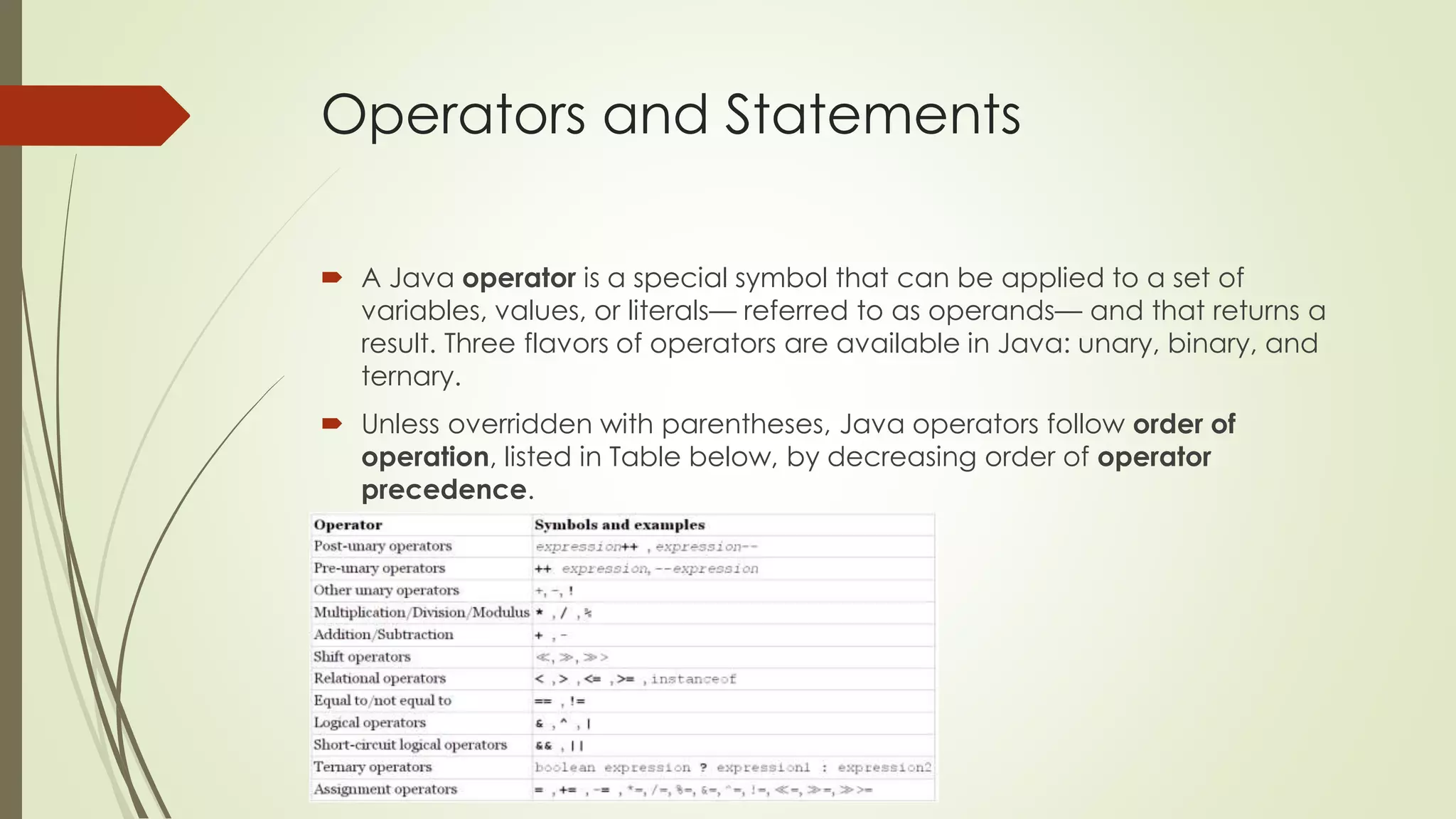 Operators in Java include unary, binary, and ternary operators that perform operations on operands. Binary operators like arithmetic, relational, and logical operators follow an order of precedence unless overridden by parentheses. Statements in Java include if-then, if-then-else, switch, while, do-while, for, and more to control program flow. The if-then statement and if-then-else statement evaluate conditions and execute code blocks conditionally. The switch statement compares a value to multiple case labels and executes the corresponding code block.