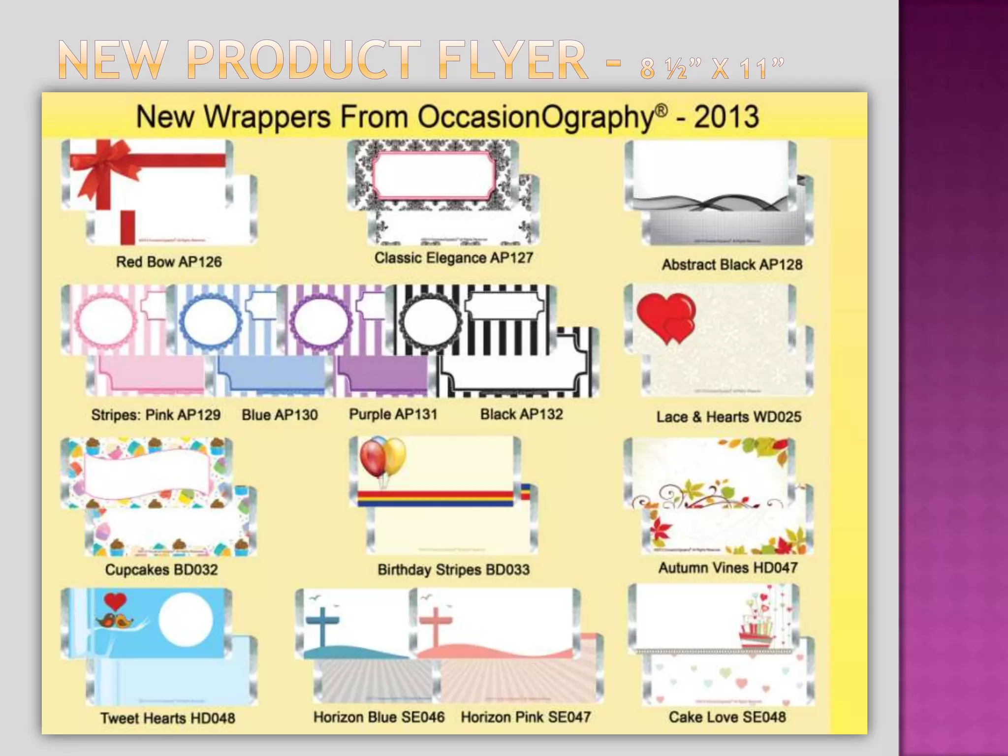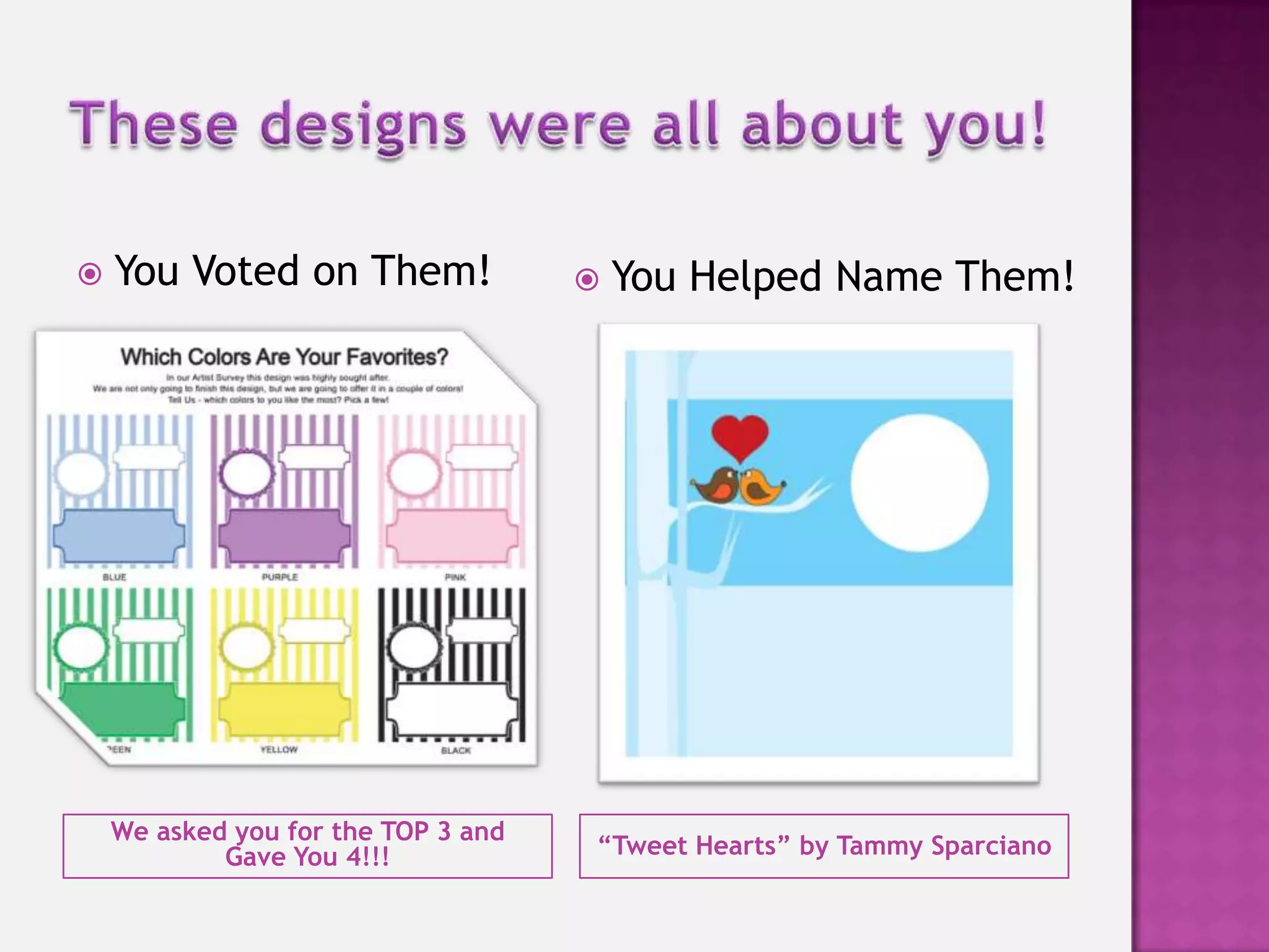 This document presents 15 new designs for foil heart shapes called "Tweet Hearts" that can be customized for various occasions. Each design lists occasions it is suitable for and complimentary foil color options. The hearts can be designed with text, pictures or logos. The document also announces that the new designs are available for purchase now, including a new product sample pack. Consultants are instructed on how to access the software update to use the new designs and told to provide any feedback on the new designs.