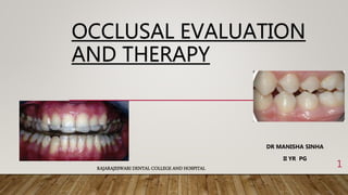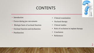 This document provides an overview of occlusion and occlusal therapy. It discusses the forces involved in jaw movement, the biologic basis of normal occlusion and occlusion-related dysfunction. It covers clinical examination techniques used to evaluate occlusion and various occlusal therapies including occlusal appliances, occlusal adjustment, splint therapy and orthodontic treatment. The goal of occlusal therapy is to establish stable functional relationships that are favorable for oral health by reducing excessive occlusal forces and correcting occlusal disharmonies.