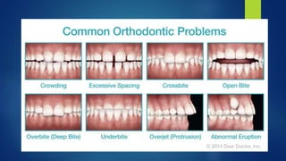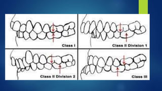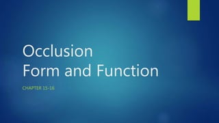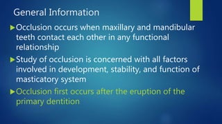 Occlusion occurs when the maxillary and mandibular teeth contact during function. Ideal occlusion involves specific patterns of contacts between teeth. Angle's classification describes the relationship between the first molars and canines. Proper tooth positioning and morphology allow for appropriate mastication and protection of supporting structures.