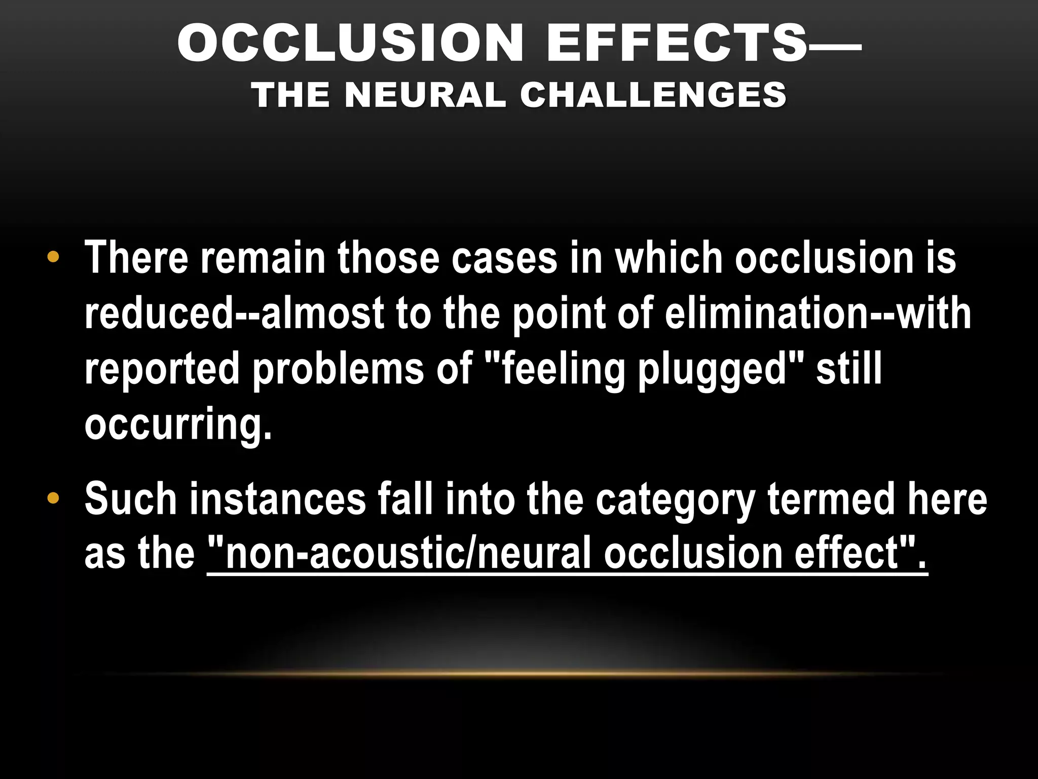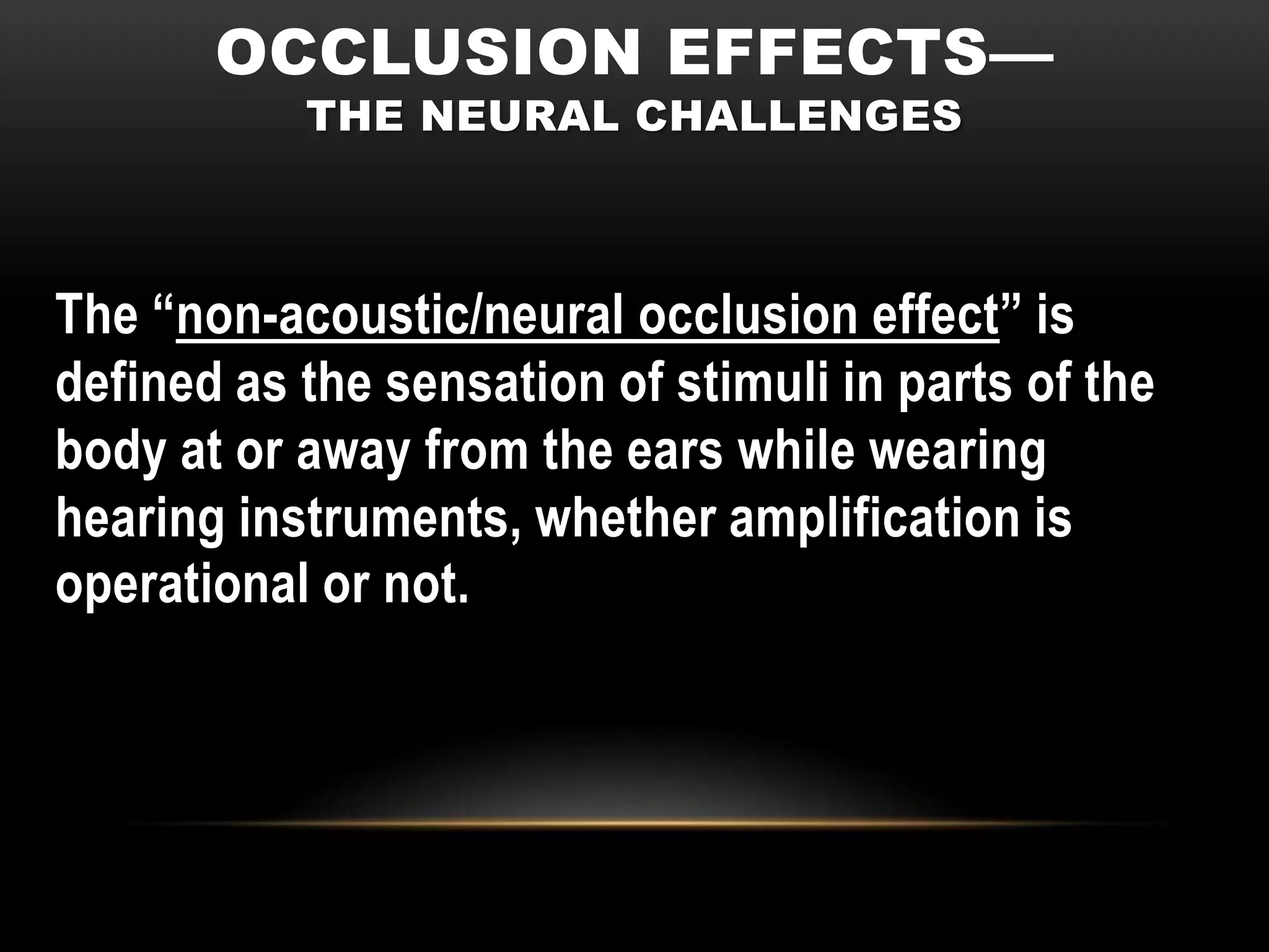 The document discusses the neural challenges associated with occlusion effects when wearing hearing aids. It defines non-acoustic/neural occlusion as sensations in the body from hearing aids whether they are on or off. This is believed to be caused by pressure on the nerves of the outer ear. It involves four cranial nerves and two cervical nerves that innervate the outer ear and may cause symptoms away from the ears like headaches or neck tension. Individual variability in nerve pathways means occlusion effects will vary between people.