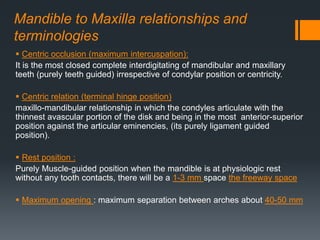 The document discusses occlusion in prosthodontics, detailing key concepts such as centric occlusion, centric relation, and mandibular movements related to dental function. It explains the anatomical and physiological relationships between maxilla and mandible, including movements during mastication and speech. Additionally, it outlines the roles of occlusal surfaces and muscle guidance in achieving harmonized dental function and addresses the implications for prosthodontic treatments.