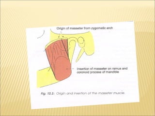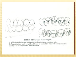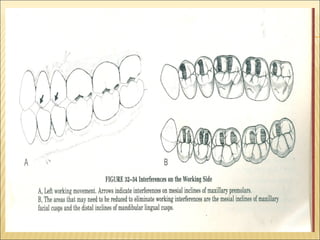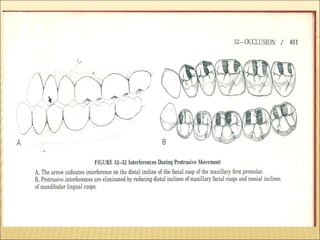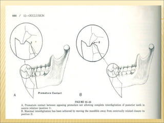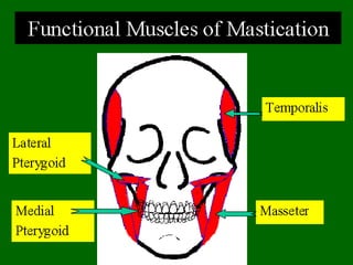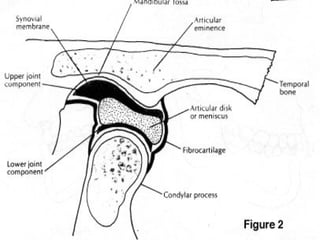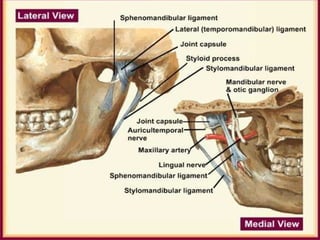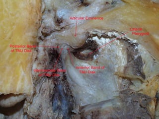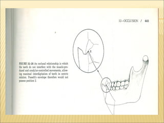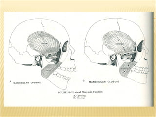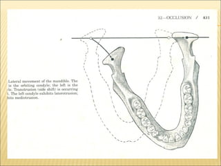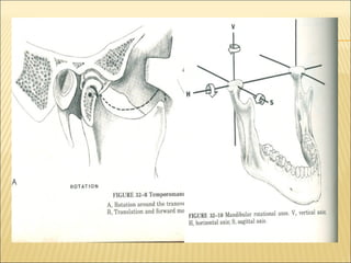 The document defines various anatomical structures and movements of the temporomandibular joint (TMJ). It describes the TMJ as a synovial joint that allows hinge-like and sliding movements between the condyle of the mandible and temporal bone. Key terms defined include the articular disc, ligaments, muscles of mastication, and different movements such as protrusion, retrusion, and lateral excursions.
