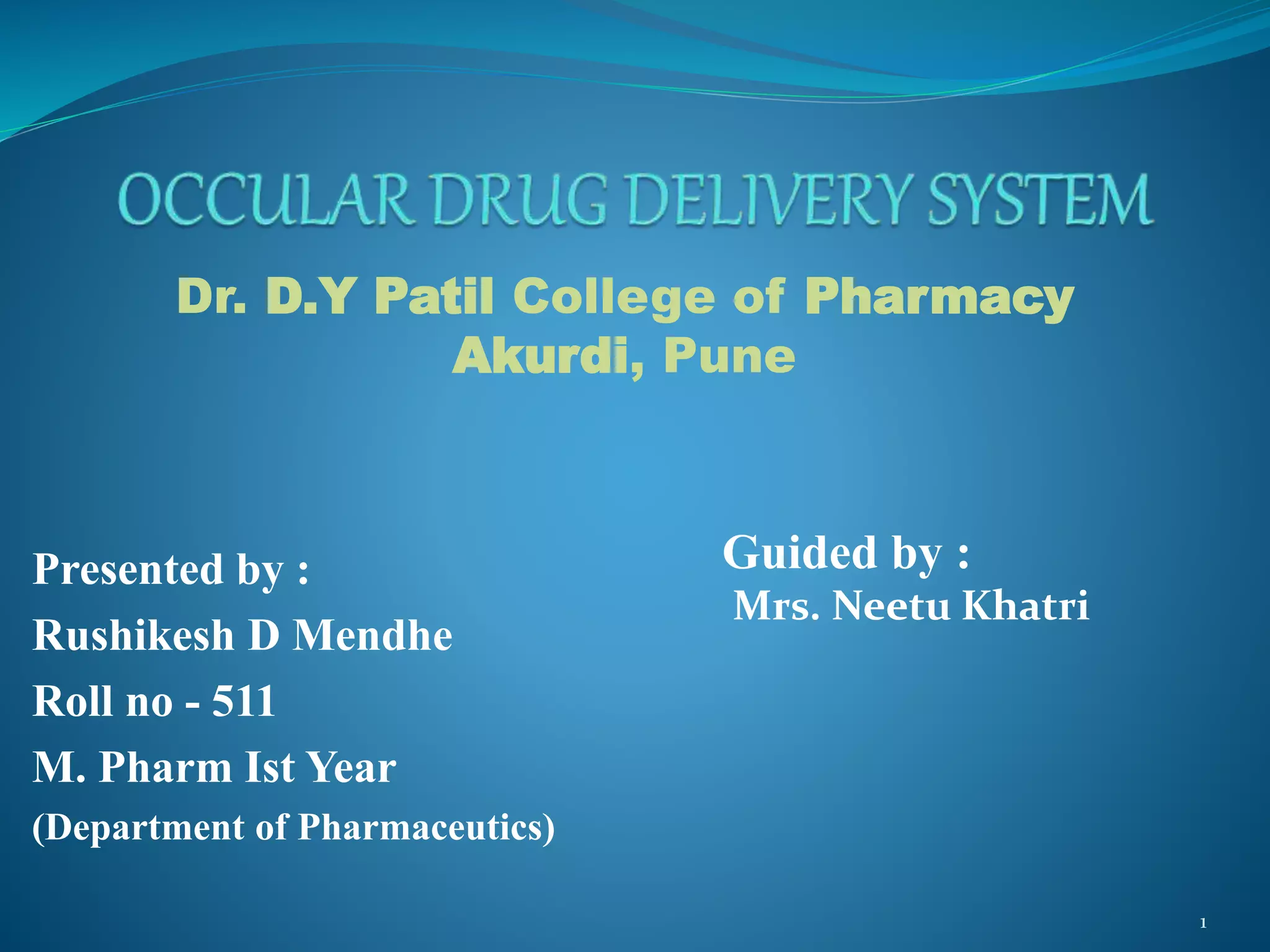The document discusses ocular drug delivery systems. It begins with an introduction to ocular drug delivery and the challenges associated with it. It then describes the anatomy and structures of the eye. The main routes of ocular drug delivery are topical, subconjunctival, and intravitreal administration. Barriers to delivery include physiological barriers like tear turnover and anatomical barriers like tight corneal cell junctions. Various ocular drug delivery systems are outlined including conventional, vesicular, controlled release, and particulate systems. Emerging advanced systems like scleral plugs, gene therapy, and stem cell therapy are also summarized. Evaluation methods for different ocular formulations and some examples of marketed ophthalmic products are provided.