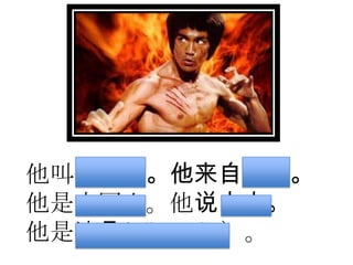 他叫李小龙。他来自中国。 他是中国人。他说中文。 他是演员(yǎnyuán)。