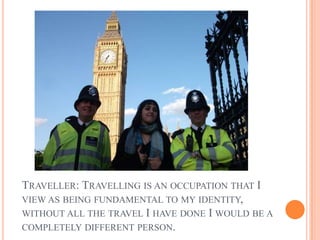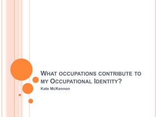 Kate McKennon identifies several occupations that contribute to her occupational identity, including travelling, working as a barmaid, listening to music, drawing, reading, sewing, meditating, studying, cooking, and running. As a traveller, barmaid, and reader she has discovered new interests and skills. Drawing, music, sewing, meditation, cooking and running are long-standing occupations that influence how she sees herself. Her primary occupational identity currently comes from her role as a student.