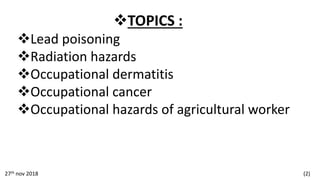 This document discusses various occupational hazards including lead poisoning from industries like smelting and recycling, radiation hazards from industries like nuclear power and medical imaging, occupational dermatitis from chemical exposure, occupational cancers caused by chemicals, dusts and radiation, and hazards for agricultural workers like zoonotic diseases, accidents, toxic chemicals and physical hazards. It provides details on the causes, health effects, treatments and preventive measures for many of these occupational hazards.