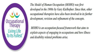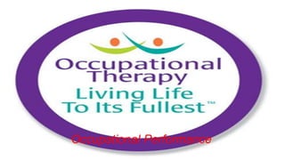 Occupational performance refers to the ability to carry out day-to-day activities that are meaningful and purposeful to one's life and identity. It encompasses activities related to self-care, productivity, and leisure that allow individuals to participate in desired life situations. Factors such as physical and mental health, motivation, environment, and habits can influence a person's occupational performance.