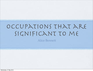 The document discusses several occupations that are important to Alice Bennett's occupational identity. Road cycling, camping, baking, skiing, traveling, running, family, yoga, and becoming an occupational therapist are all mentioned as significant. Road cycling has been part of her identity since she was young, while camping and skiing involve traditions with family and belonging to groups. Baking, running, yoga, and becoming an occupational therapist relate to concepts of doing, becoming, and belonging. Family is described as very important and involving the roles of being a daughter, sister, and granddaughter.