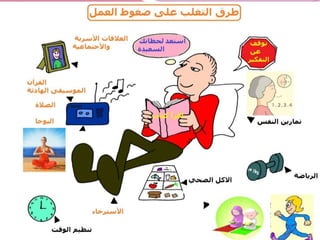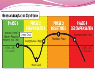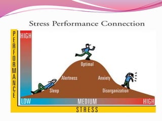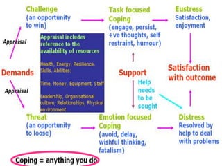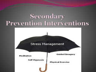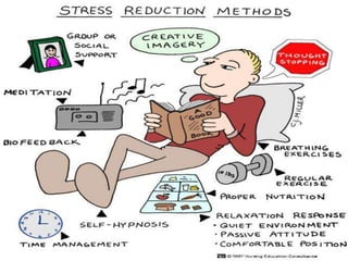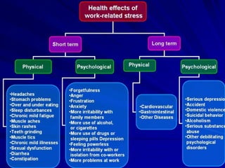 This document provides an overview of work stress and strategies for managing it. It discusses the history of research on occupational stress beginning in the 1970s. Key researchers who advanced understanding of stress and physiological responses like the fight-or-flight response are cited. Models for understanding sources of job stress and their health impacts are presented. The most and least stressful jobs are listed according to one study. Primary, secondary and tertiary approaches for preventing and intervening in work stress are defined with examples like exercise, relaxation, and cognitive-behavioral therapy.