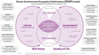 The document outlines the principles and practices of occupational therapy, emphasizing the importance of enabling individuals to engage in meaningful daily activities that promote health and well-being. It details the components of occupational performance, including the roles and tasks individuals assume within their environment, and describes the process of occupational therapy from referral to discharge. Additionally, it highlights the significance of documentation in the therapeutic process and the need for person-centered approaches to treatment.