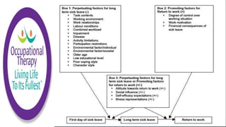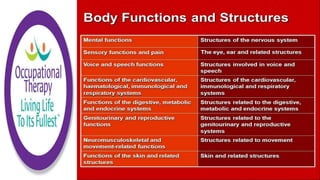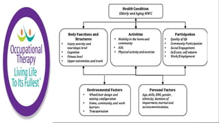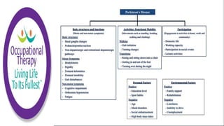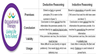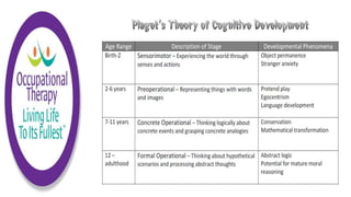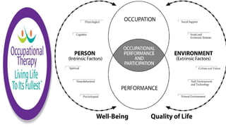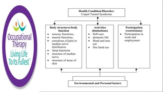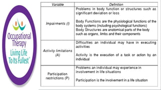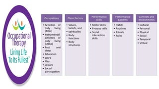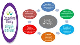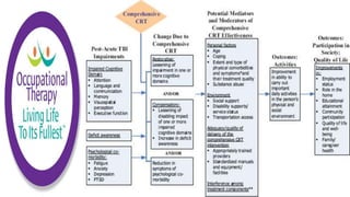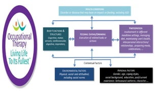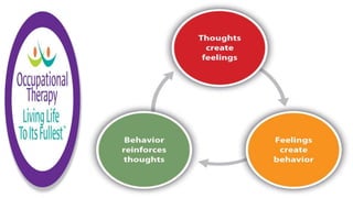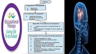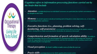 Cognition refers to various mental processes such as attention, memory, executive functions, comprehension, and perception. Occupational therapists use a dynamic interactional approach to evaluate and treat cognitive impairments. This approach views cognition as the dynamic interaction between a person, their tasks, and their environments. Occupational therapists evaluate clients through standardized and dynamic assessments to understand their cognitive strengths and limitations. Therapists then develop individualized interventions focused on building awareness, teaching strategies, and modifying tasks and environments to improve clients' cognitive performance and participation in daily activities.