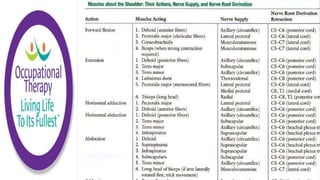 Manual muscle testing is used by occupational therapists to evaluate muscles' ability to generate force and assess impairments. It involves instructing a patient to hold a limb against the therapist's opposing resistance through a range of motion. Grades from 0 to 5 are used to rate strength based on whether movement can be completed against gravity and additional pressure. While useful, manual muscle testing relies on a therapist's strength; dynamometry provides more objective strength measurements but requires expensive equipment. Both types of testing only approximate muscle function during daily activities.
