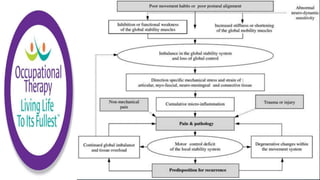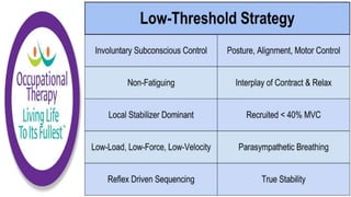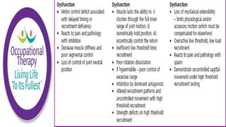 Occupational therapy focuses on improving range of motion, strength, and endurance through exercise. Biomechanics analyzes human motion through kinematics, which describes movement, and kinetics, which describes the forces behind movement. The musculoskeletal system uses levers and torque generated by muscles to enable motion. Muscles contain contractile filaments that slide past each other to generate force through motor unit recruitment and firing rates. Understanding biomechanics and physiology allows occupational therapists to design effective treatment programs.