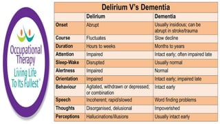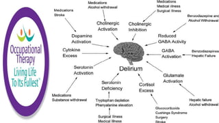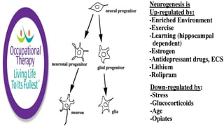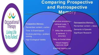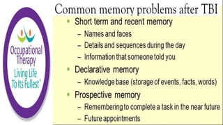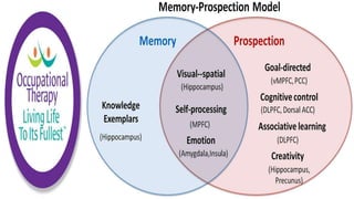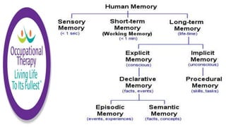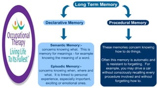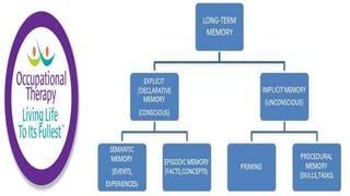 This document discusses how memories are formed and stored in the brain. It explains that memories are formed through synaptic plasticity, which refers to changes in the strength of connections between neurons. These connections are made stronger or weaker based on past activation patterns. Three key areas involved in memory are the hippocampus, which forms episodic memories; the amygdala, which attaches emotional significance; and the neocortex, where memories may be consolidated over time. Different memory systems rely on different brain regions, such as the basal ganglia and cerebellum for implicit memories, and the prefrontal cortex for working memory. The document also outlines how occupational therapists assess memory through standardized tests and occupation-based evaluations.