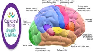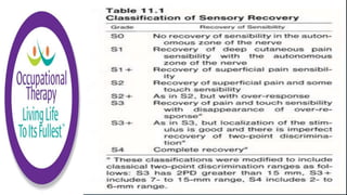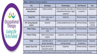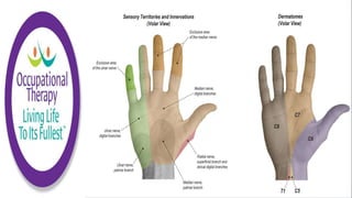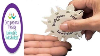 The document discusses various topics related to occupational therapy for sensory testing and assessment of the hands. It covers topics like protective sensation, hyperesthesia, pain assessment, and interventions like desensitization. Some key points include: