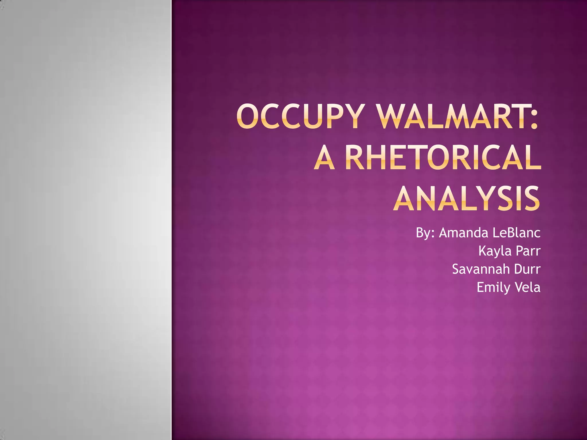 Grayson argued against selling his small coffee shop to Walmart, using logical arguments as well as rhetorical devices to create an emotional response and portray Walmart negatively. Though he resorted to some fallacious arguments, his overall presentation was stronger. Calen mainly used fallacious arguments and attacked irrelevant points, undermining his own credibility. The document concludes that Grayson won the argument.