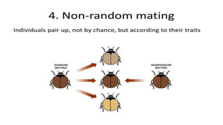 2. It explores the genetic basis of evolution through concepts like population genetics, gene flow, allele frequencies, non-random mating, and the Hardy-Weinberg equilibrium.