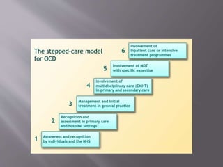 This document provides an overview of obsessive compulsive disorder (OCD), including its definition, symptoms, causes, diagnosis and treatment. OCD is characterized by intrusive thoughts (obsessions) and repetitive behaviors (compulsions) performed to reduce associated anxiety. It has been linked to imbalances in serotonin and dopamine levels in the brain. Treatment involves cognitive behavioral therapy and medication, primarily selective serotonin reuptake inhibitors. The goals of treatment are to reduce symptoms and restore optimal functioning.