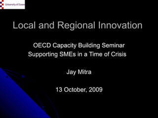 This document discusses local and regional innovation systems. It begins by defining key concepts like entrepreneurship, innovation, culture, and entrepreneurial culture. It then discusses why innovation systems are important by noting that innovation involves interactions between many actors. It outlines some key models of innovation systems like national and regional innovation systems. It provides stylized facts about innovation being spatially concentrated and the role of SMEs. It discusses different frameworks for analyzing innovation processes in regions. It then defines regional innovation systems as involving knowledge generation and exploitation subsystems linked to other systems. It notes some basic arguments for why regional innovation systems are important like the role of tacit knowledge and lower costs of interaction at the regional level. Finally, it discusses conditions for assessing