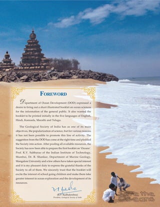 The document provides an introduction to a booklet on ocean sciences created by the Geological Society of India. It summarizes that the Department of Ocean Development requested the booklet to educate the general public in multiple languages. The Geological Society took on the project with help from experts. The president expresses gratitude to the contributors and hopes the booklet will increase children's interest in ocean exploration.