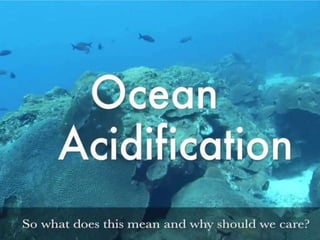 The document discusses ocean acidification, defined as the reduction in ocean pH due to anthropogenic CO2 uptake, which results in increased acidity affecting marine organisms that rely on calcium carbonate for their hard parts. It details the chemistry of ocean acidification, the impact of rising atmospheric CO2 levels, and how this phenomenon has evolved over time, including projections for future acidification and its effects on marine ecosystems. The document highlights the threats to marine biodiversity, particularly coral reefs and calcifying organisms, due to reduced calcification and altered chemical conditions in ocean waters.