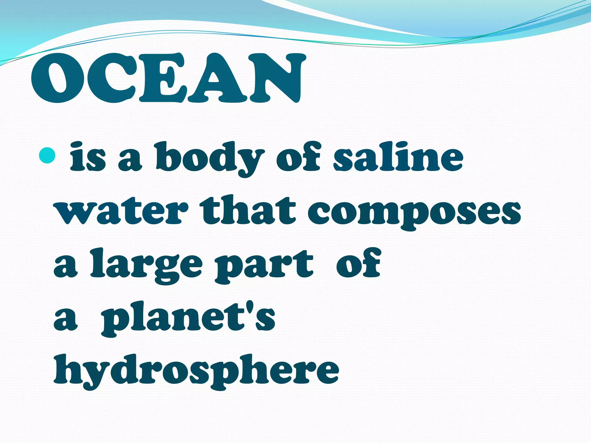The document discusses oceans and seas. It defines an ocean as a major body of saline water that covers approximately 71% of the Earth's surface. Oceans are very deep and include the Pacific, Atlantic, Indian, Arctic, and Southern Oceans. Seas are smaller bodies of water located where land and ocean meet, and are partially enclosed by land. Examples include the South China Sea, Mediterranean Sea, and Arabian Sea. The color of the oceans is largely due to how light from the sun reflects off ocean waters.