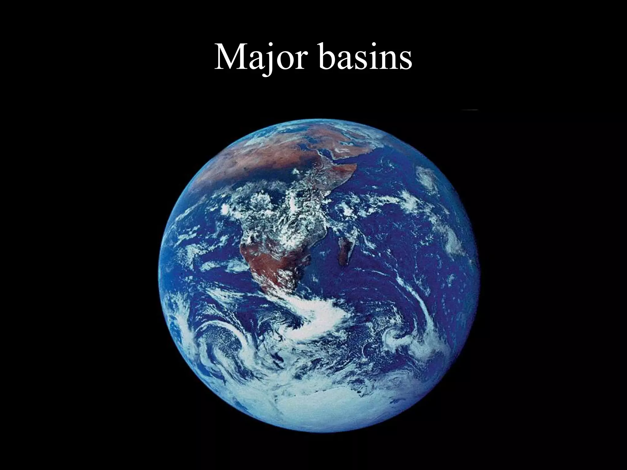 The document summarizes the major ocean basins of the world. It describes the general characteristics of the Pacific, Atlantic, Indian, Arctic, and Southern Oceans, including their average depths, geological features, and freshwater inputs. It also lists marginal seas surrounding each ocean and provides additional details on the largest/smallest oceans, deepest ocean trenches, saltiest seas, and historical definition of "the seven seas".