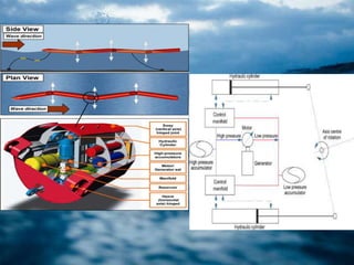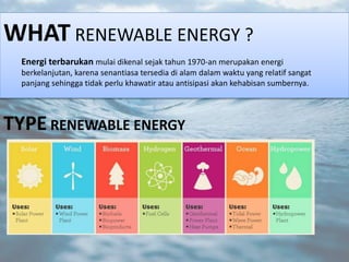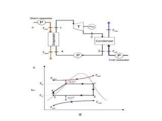Dokumen tersebut merangkum beberapa sumber energi terbarukan dari laut seperti energi gelombang, pasang surut, dan perbedaan suhu antara permukaan dan dasar laut. Teknologi konversi energi gelombang meliputi oscilating water column, overtopping, dan oscillating body sedangkan untuk pasang surut menggunakan tidal barrage dan tidal current turbine. Konversi perbedaan suhu dikenal dengan ocean thermal energy conversion yang memanfaatkan perbedaan suhu antara air permukaan dan dasar