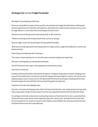 The document outlines various types of vessels used in international seafreight, including container ships, tankers, and bulk carriers, each serving specific cargo requirements. It discusses the main international shipping routes, emphasizing high-traffic areas such as routes from China to the UK and the costs associated with sea freight, which can be influenced by various factors. Lastly, it highlights the necessary documentation for shipping goods by sea, including delivery instructions and bills of lading.