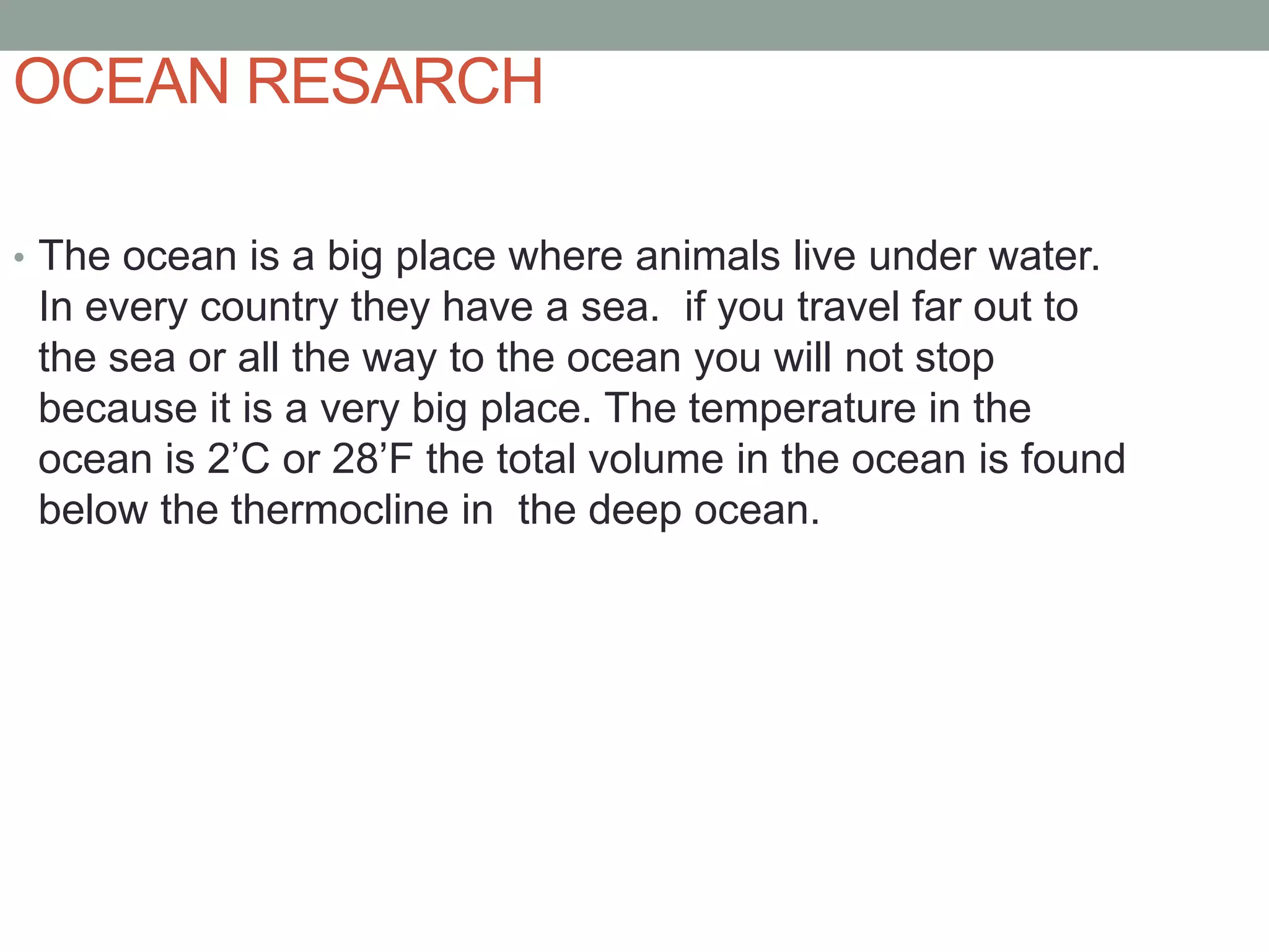 The document discusses various topics related to oceans including their size, depth, threats, and food chains. The ocean covers over 70% of the planet's surface and has an average depth of over 4,000 meters. Animals in the ocean must deal with predators, including humans, as they search for food. Threats facing the oceans include oil spills, overfishing, and garbage. Food chains and webs show how different ocean creatures obtain energy and nutrients.