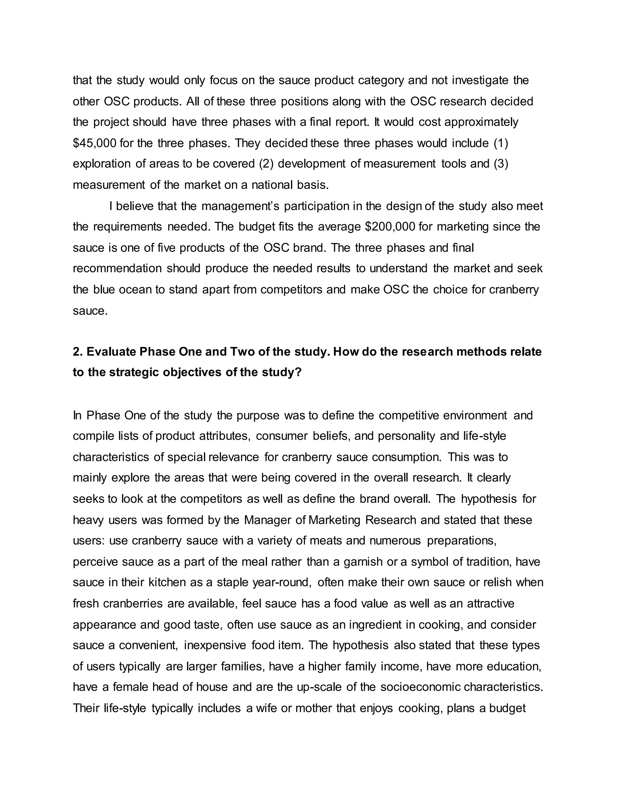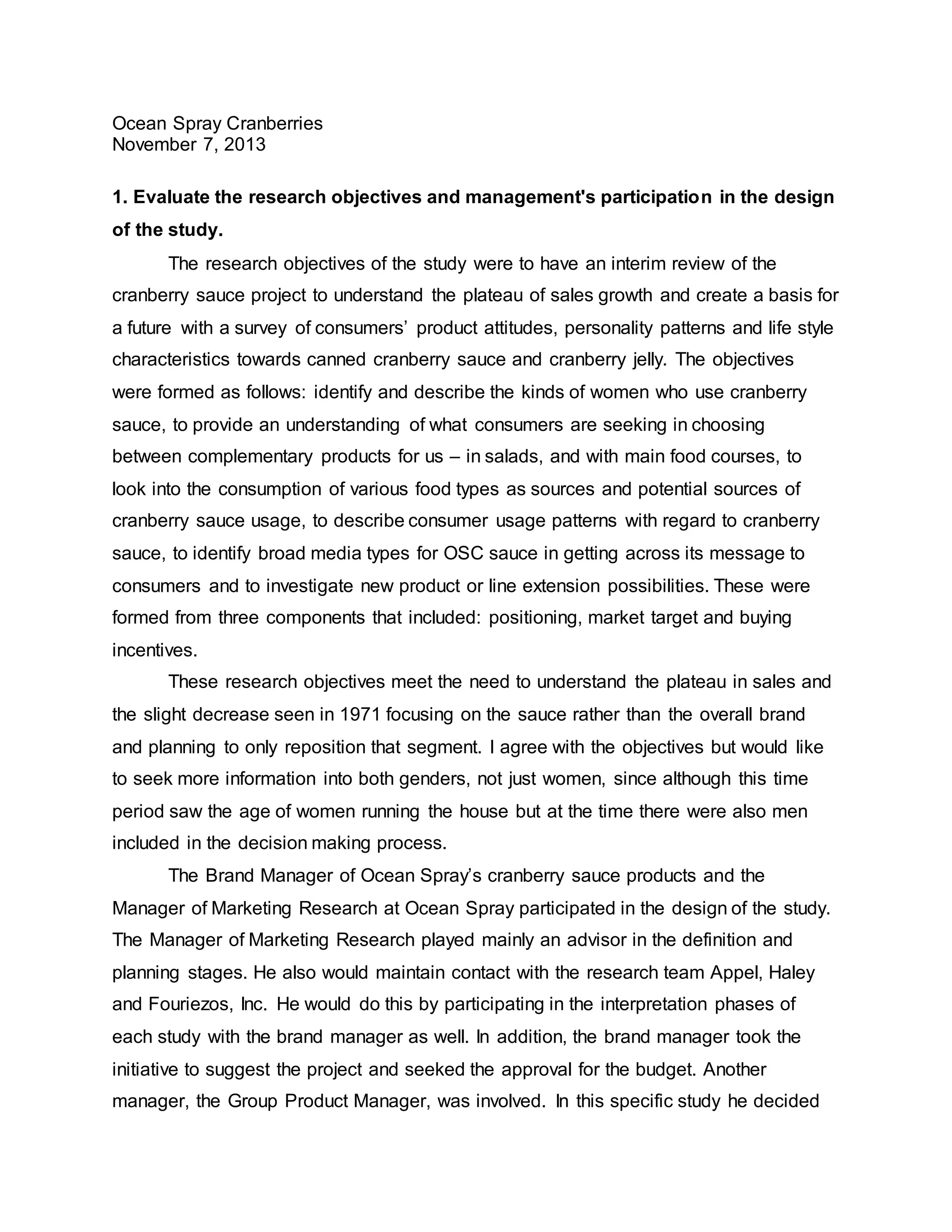 The research objectives of the study were to understand declining cranberry sauce sales and create a basis for future growth. Management participated in designing a 3-phase study to explore consumer attitudes, behaviors, and lifestyle characteristics related to cranberry sauce usage. Phase 1 involved focus groups and perceptual mapping to develop hypotheses about heavy and light users. Phase 2 used a questionnaire to validate these hypotheses and identify key dimensions. Statistical analysis including cluster, discriminant, and factor analysis identified 4 consumer segments - convenience, enthusiastic cooks, disinterest, and decorators. This provided support for recommendations to promote new uses, change perceptions, focus communications, and develop new products to increase consumption.