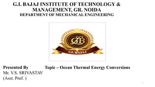 This document discusses Ocean Thermal Energy Conversion (OTEC) technologies. OTEC uses the temperature difference between warm surface seawater and cold deep seawater to produce electricity. There are three main types of OTEC systems - open cycle, closed cycle, and hybrid cycle. OTEC has advantages such as steady base load power production and byproducts like fresh water. However, it also has disadvantages like low efficiency due to small temperature differences and challenges associated with operating in an ocean environment. The document provides examples of OTEC applications and references for further information.