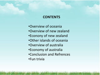 This document provides an overview of the geopolitical environment in Oceania, focusing on New Zealand and Australia. It outlines that New Zealand has a parliamentary democracy and was first inhabited by the Maori people over 1000 years ago. Its economy is driven by agriculture, forestry, horticulture and tourism, with dairy being a major export. Australia has a population of over 23 million and its economy relies heavily on mining and agriculture. It has a GDP of $1.3 trillion and unemployment of 5.5%, though economic growth has missed forecasts recently. Key references are provided at the end.