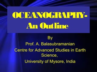 The document outlines oceanography, detailing the significance of oceans as vital ecosystems covering 70% of the Earth's surface and hosting diverse marine life. It discusses the five major oceans, their geographical characteristics, and the interconnectedness with climate regulation and human survival. Various branches of oceanography, including physical, chemical, biological, and geological oceanography, are highlighted, emphasizing their interdisciplinary nature and the tools used by oceanographers to study these environments.