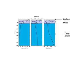 3) Ocean properties vary with depth, forming three layers - a warm mixed surface layer, a thermocline of rapid temperature drop, and cold deep water below. Temperature, salinity, and pressure interact to influence ocean density stratification.
