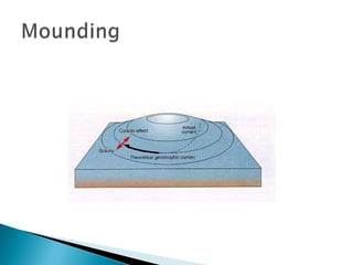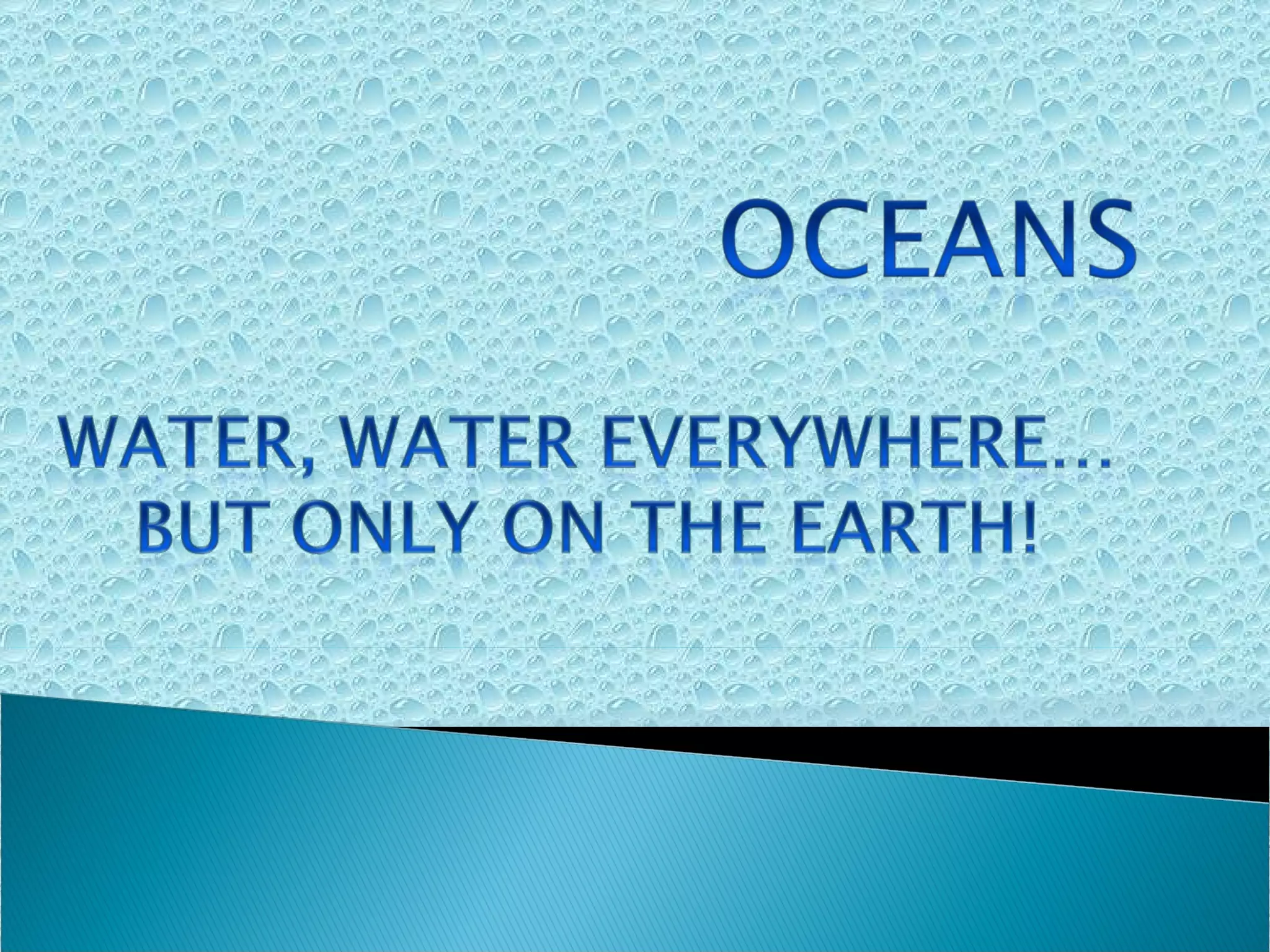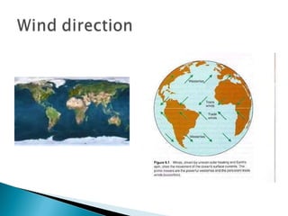 Over 70% of the Earth's surface is covered by water, with 95% being salt water and only 5% fresh water. The world's oceans are interconnected and divided into the Pacific, Atlantic, Indian, and Arctic oceans. Tides occur twice daily due to gravitational pulls from the moon and sun, with the moon having a stronger effect. Ocean currents include surface currents in the upper 400 meters and deep water currents driven by temperature and salinity differences that cause density variations and sinking in cold regions. Currents are influenced by primary forces like heating, winds, and gravity and secondary forces like the Coriolis effect that cause surface currents to flow and gyres to form in ocean basins.