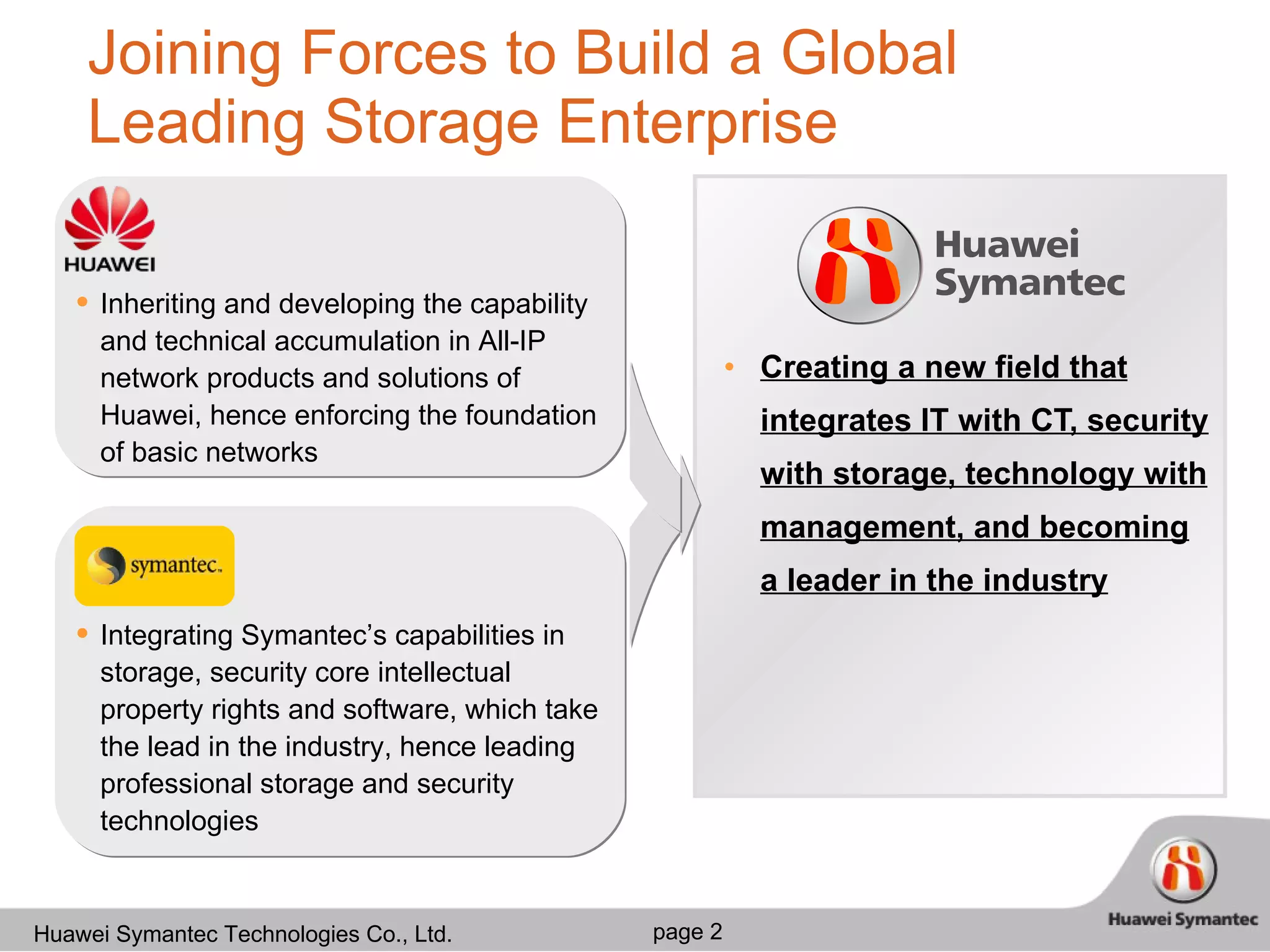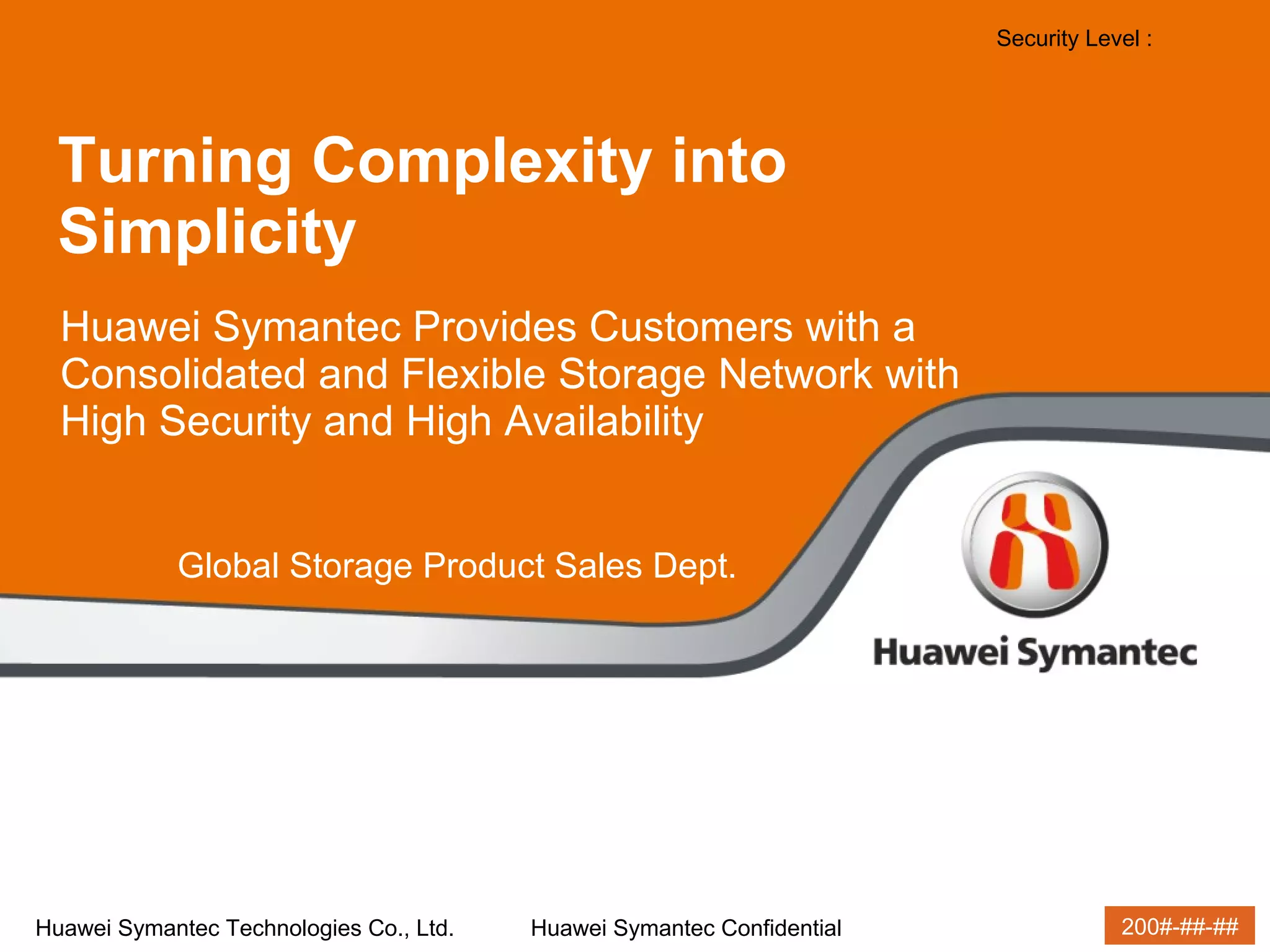 Huawei Symantec provides a consolidated and flexible storage network solution called VIS6000 that simplifies storage management, improves security and availability, and enables data migration and disaster recovery across heterogeneous storage platforms. Key features include virtualization, centralized management, snapshot and replication technologies, and support for consolidating different storage arrays into a single resource pool.