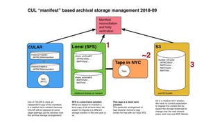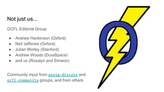 This document provides an overview of the Oxford Common File Layout (OCFL) specification for digital preservation. It summarizes the goals of OCFL, which are to enable the completeness, parsability, robustness, and storage of digital objects on a variety of infrastructures. The key components of an OCFL system include OCFL objects, which group content files and metadata into versioned directories, and OCFL storage roots, which provide a hierarchical storage structure for multiple OCFL objects.