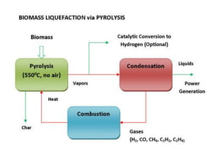 - Types of biomass gasification such as pyrolysis, hydrolysis, hydrogenation, and gasification. Pyrolysis involves thermal decomposition of biomass in an inert atmosphere. Hydrolysis uses water to break chemical bonds. Hydrogenation treats substances with hydrogen gas.